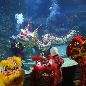 当日,位于泰国曼谷市中心的暹罗海洋世界举办迎新年活动,潜水员在水下表演舞龙,吸引市民前来观赏。