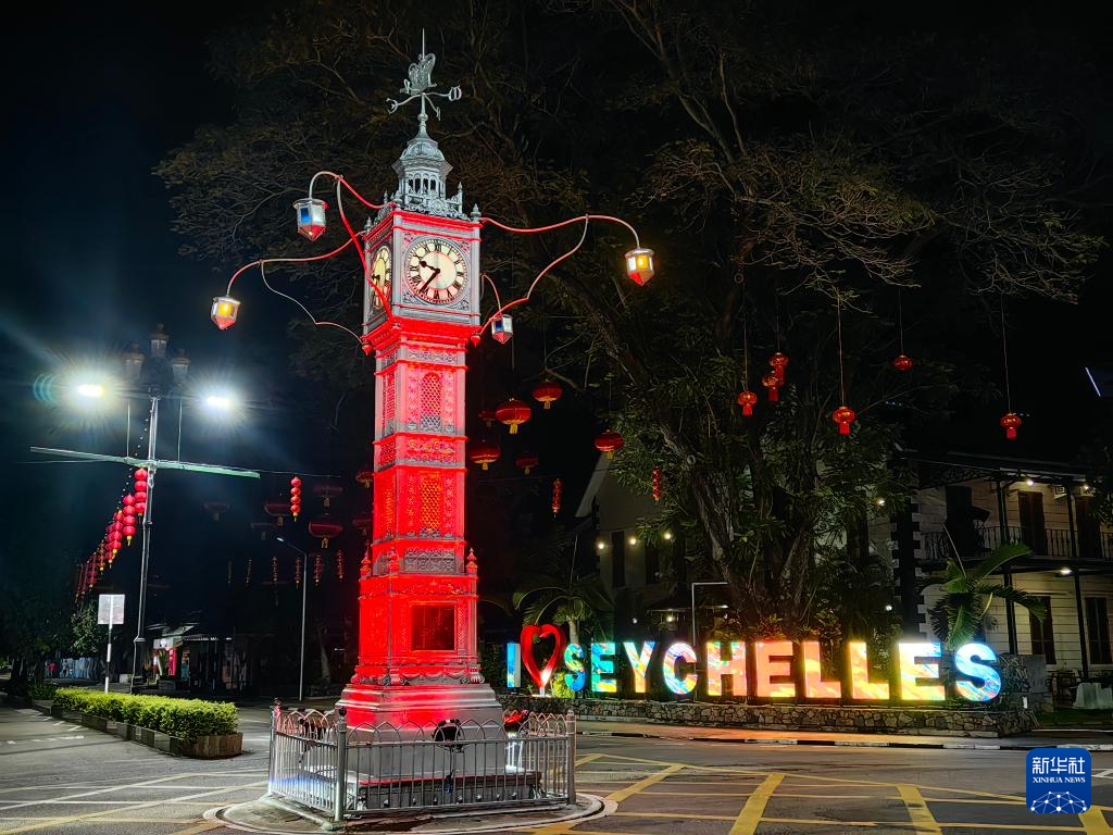 当日晚,印度洋岛国塞舌尔首都维多利亚市的地标建筑“小本钟”点亮“中国红”,迎接中国新年。“小本钟”于1903年建成,是塞舌尔首都维多利亚市钟楼的别称。