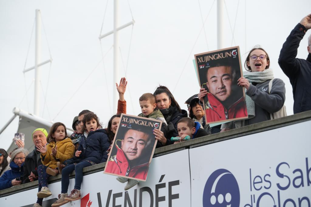 随着船只驶入港口内的航道,两侧防波堤上等候的人们爆发出热烈的掌声和欢呼声。人群中不仅有挥舞着中国国旗的同胞,还有许多法国当地的航海运动爱好者。不少法国孩子兴奋地踮起脚尖,挥舞手中的画报,有些孩子试着用生硬的中文发音高喊:“京坤!京坤!”