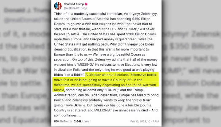 2月19日,美国总统特朗普在自创社交媒体平台“真实社交”发文称,乌克兰总统泽连斯基是“独裁者”。网络截图