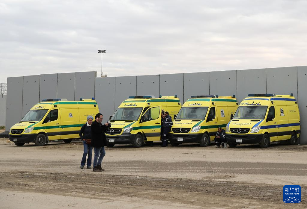 2月24日,救护车在拉法口岸埃及一侧等待进入加沙。