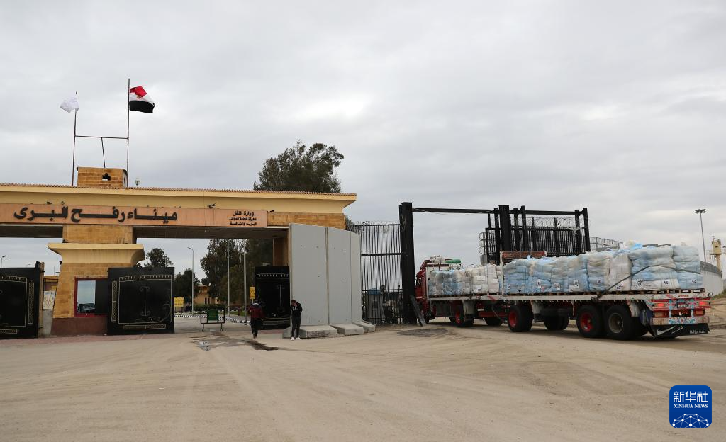 2月24日,运送援助物资的卡车通过拉法口岸埃及一侧进入加沙。