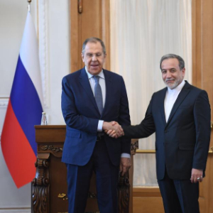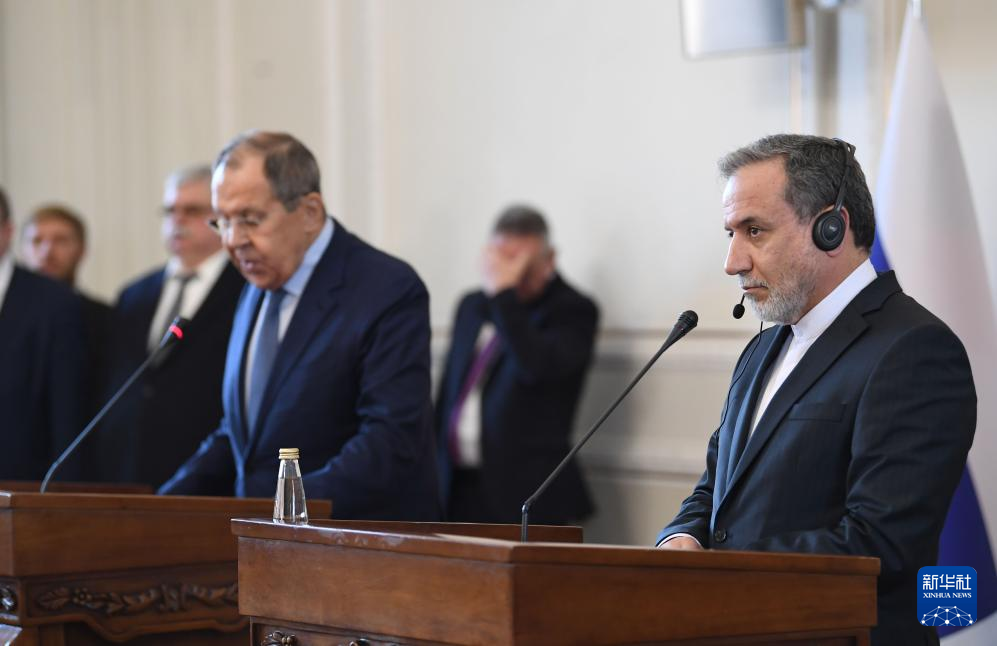 2月25日,在伊朗德黑兰,伊朗外交部长阿拉格齐(右)与俄罗斯外长拉夫罗夫出席联合新闻发布会。