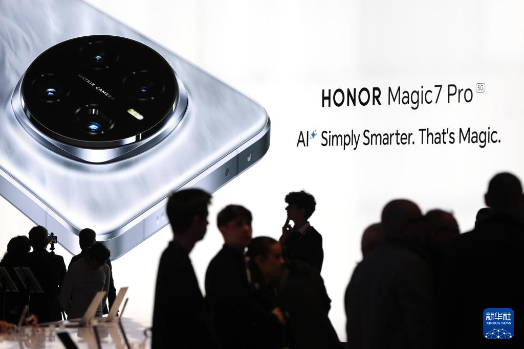 3月3日,在西班牙巴塞罗那举行的2025年世界移动通信大会上,人们参观荣耀展区。