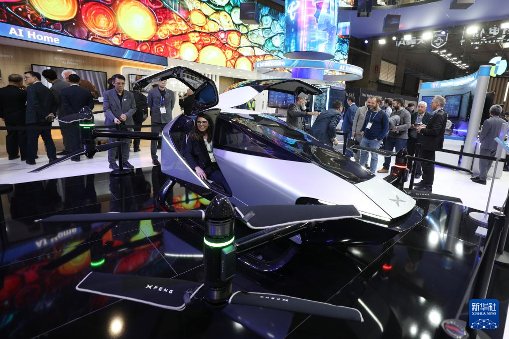 3月3日,在西班牙巴塞罗那举行的2025年世界移动通信大会上,人们在中国电信展区参观小鹏飞行汽车。