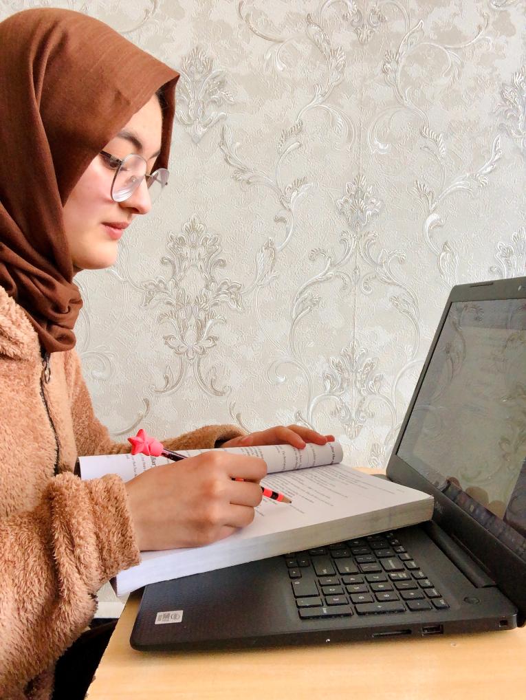 2月28日,在阿富汗喀布尔,19岁的英语教师奥扎拉·瓦尔达克在备课。新华社发(希兰摄)