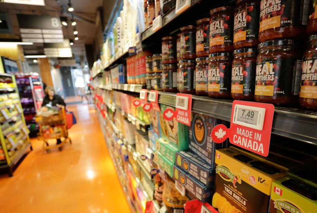 2025年2月25日,在加拿大温哥华一家超市内,加拿大商品的旁边贴着印有“加拿大制造”的标签。新华社发(梁森摄)
