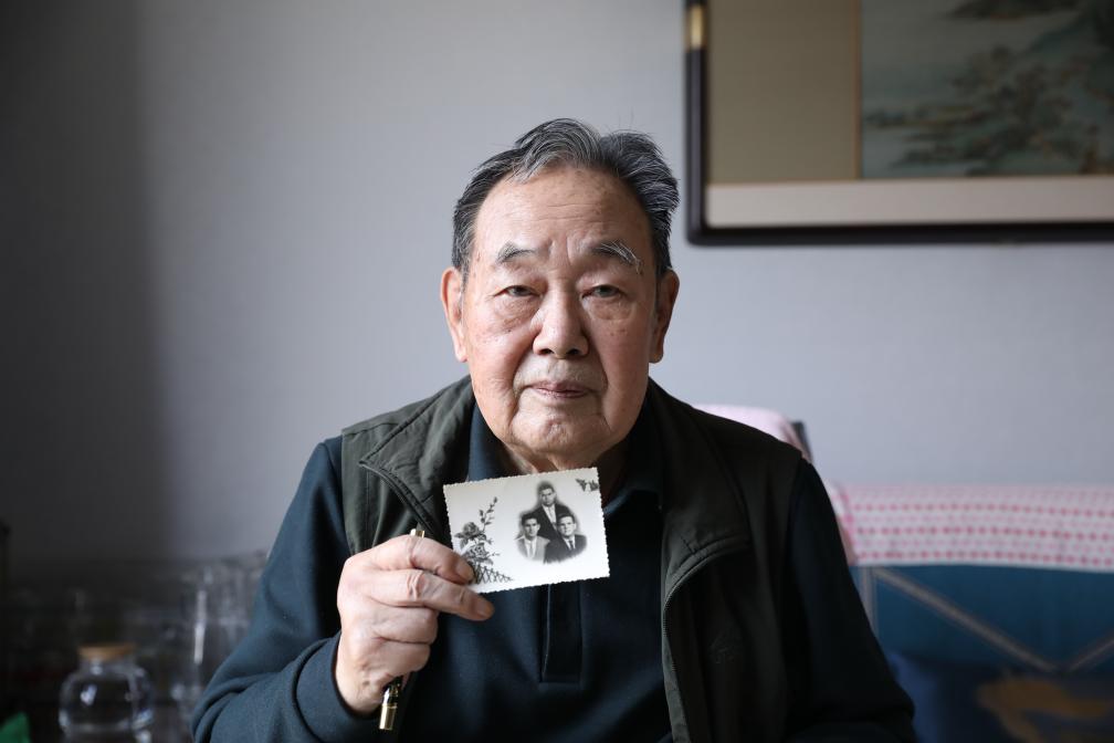 飞行教员周生敬手拿当年与古巴学员的合影照片。新华社记者 徐伟 摄