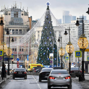 2023年12月22日,在俄罗斯首都莫斯科,车辆从新年枞树附近驶过。新华社发(亚历山大摄)