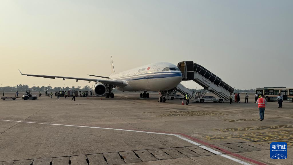 当地时间3月29日下午,中国救援队乘坐的飞机抵达缅甸仰光国际机场。新华社发(亨曼摄)