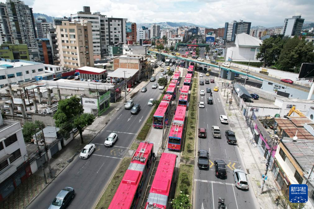 这是3月31日在厄瓜多尔首都基多航拍的宇通双源无轨电车车队。新华社发(里卡多·兰德塔摄)