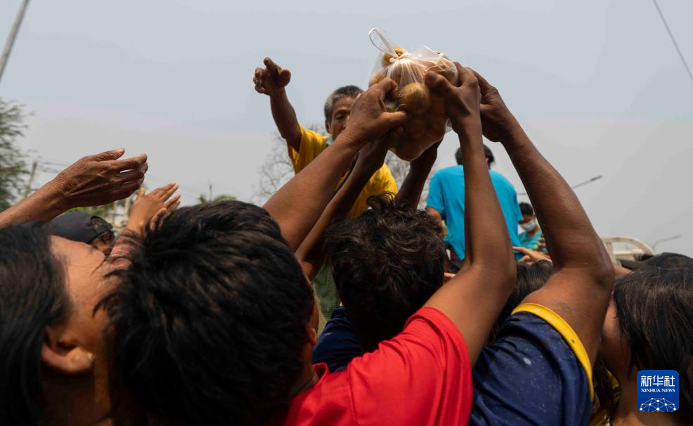 4月3日,在缅甸曼德勒医学院附近的一处安置点,人们领取食物。