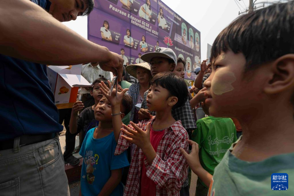 4月3日,在缅甸曼德勒医学院附近的一处安置点,儿童领取能够预防和治疗脱水的补液盐。