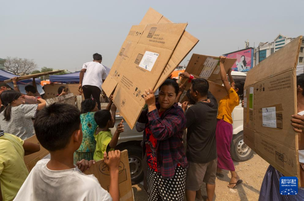 4月3日,在缅甸曼德勒医学院附近的一处安置点,人们领取可以用作临时床铺的纸壳。