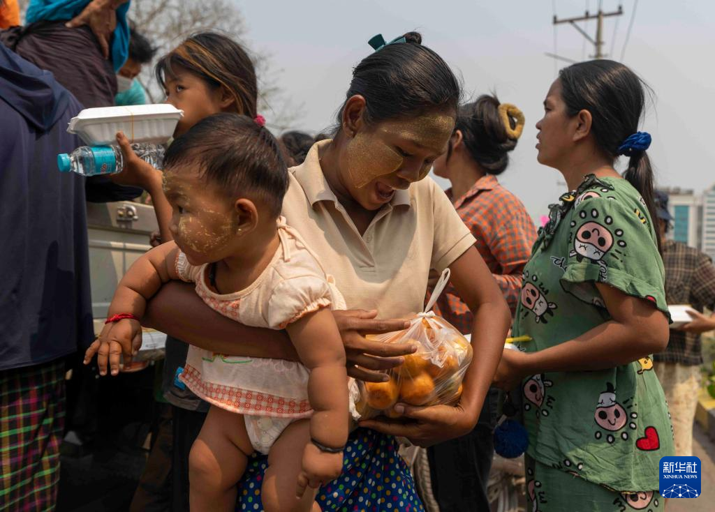 4月3日,在缅甸曼德勒医学院附近的一处安置点,一名抱孩子的女子领取食物。