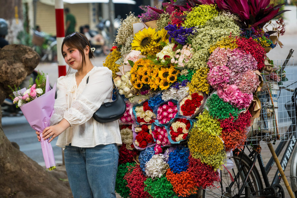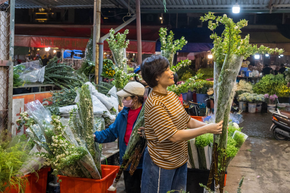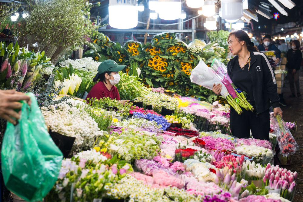 3月28日,在越南河内广霸花市,一名女士在购买鲜花。