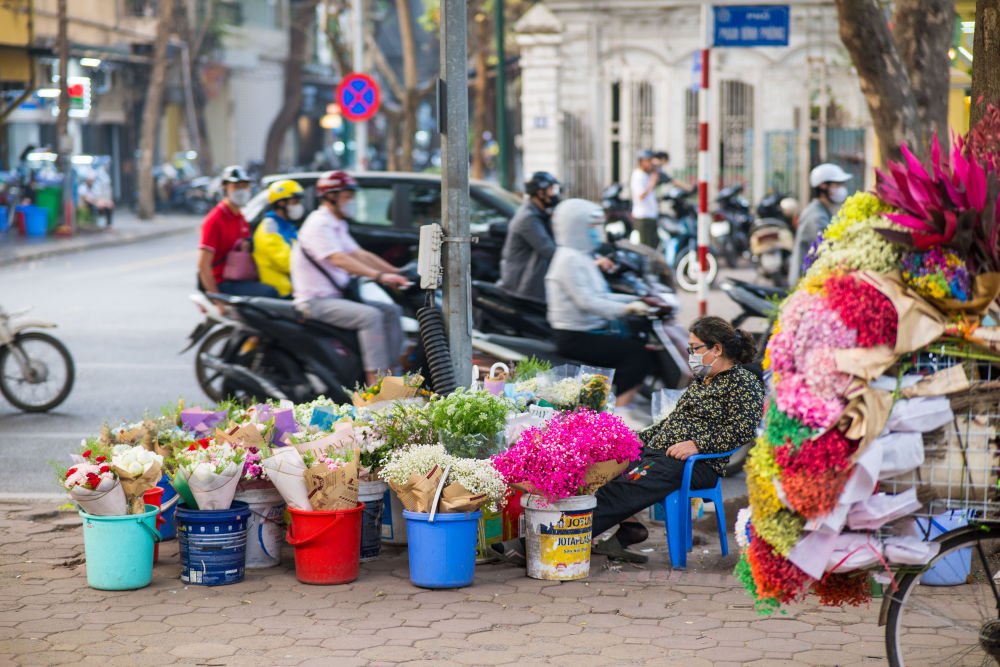 3月28日,在越南河内广霸花市,顾客在购买鲜花。这家店铺大部分鲜花产自中国云南。