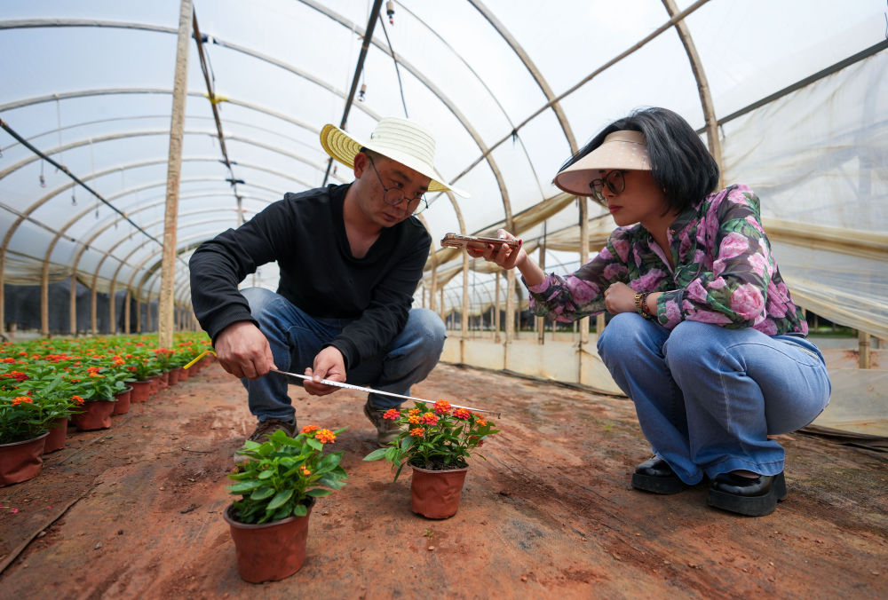 4月11日,越南花商阮翠云(右)在昆明宜良一花卉基地内拍摄一盆鲜花的尺寸。