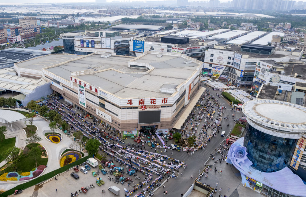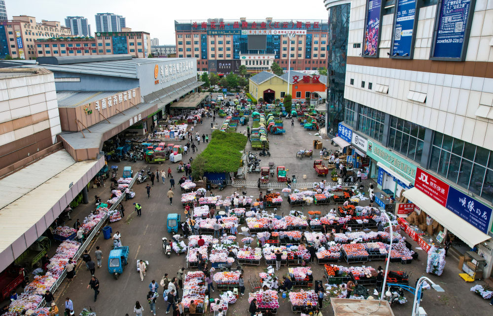 4月11日,花商在昆明斗南花卉市场内售卖鲜花(无人机照片)。