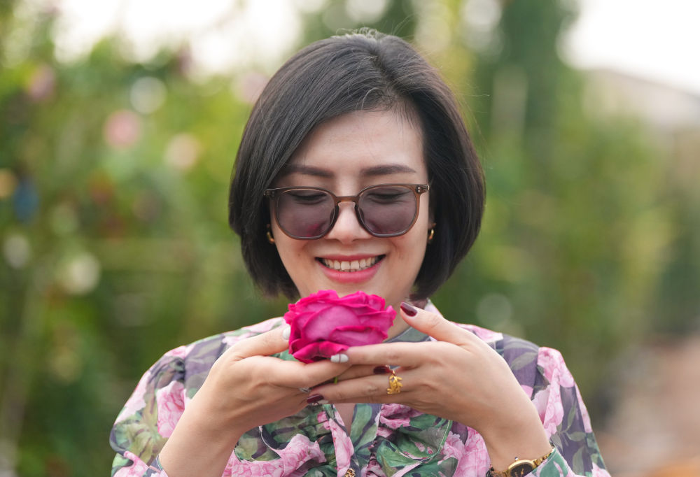 4月11日,越南花商阮翠云在昆明斗南一个花卉基地内闻花香。