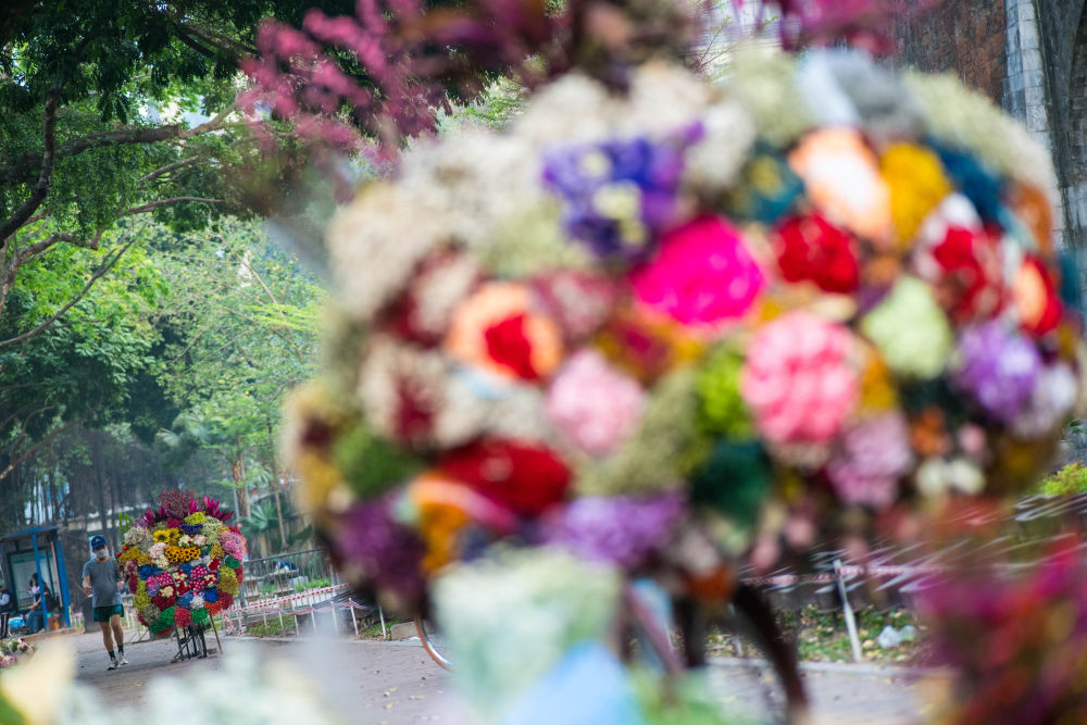 3月28日,在越南河内广霸花市,一名商贩在运送鲜花。