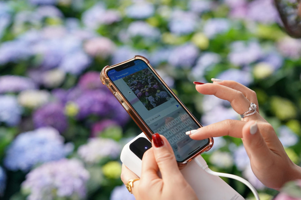 4月11日,越南花商阮翠云在昆明斗南一花卉基地内将拍摄的绣球花图片发给客户。