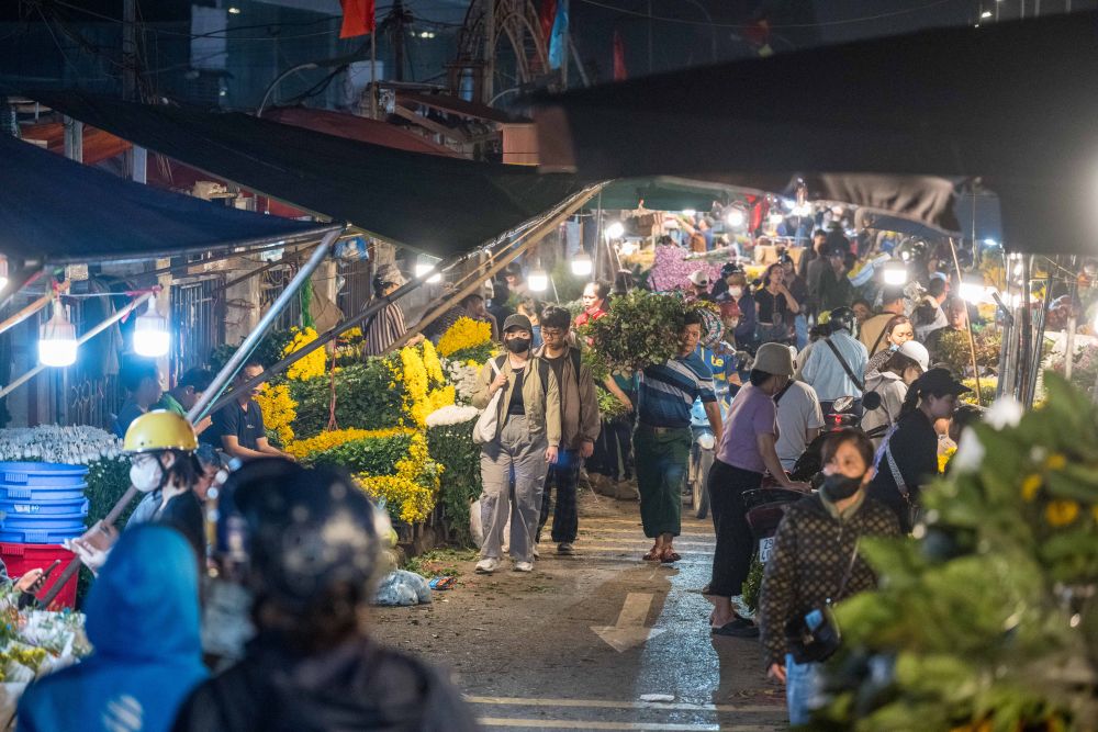 深夜的越南河内广霸花市灯火通明,一筐筐新鲜的玫瑰与百合在摊位间流转,花商们忙碌的身影与满载的货车勾勒出鲜花贸易的活力图景。