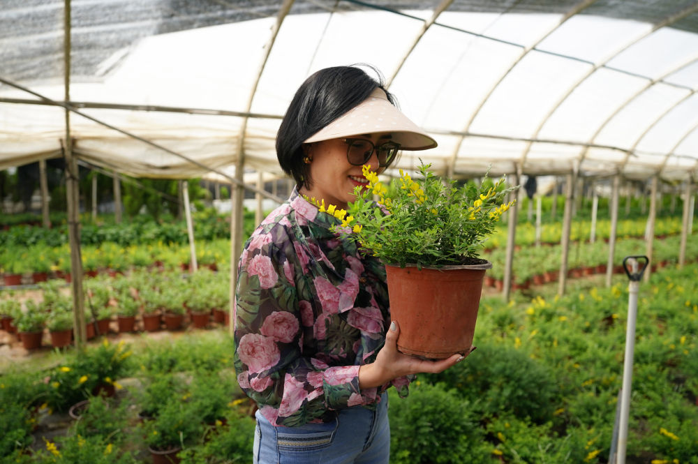 4月11日,越南花商阮翠云在昆明宜良一个花卉基地内闻一盆金雀花的香气。