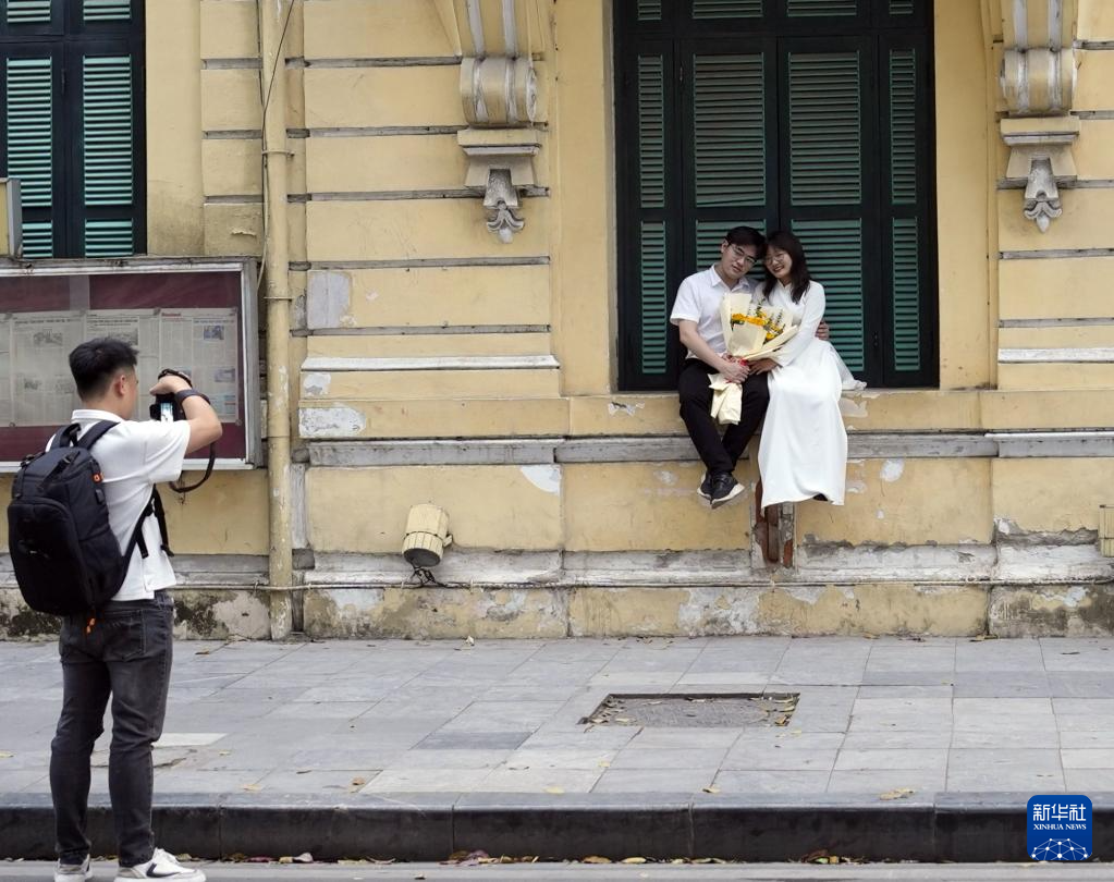 4月9日,一对情侣在越南首都河内街头合影。