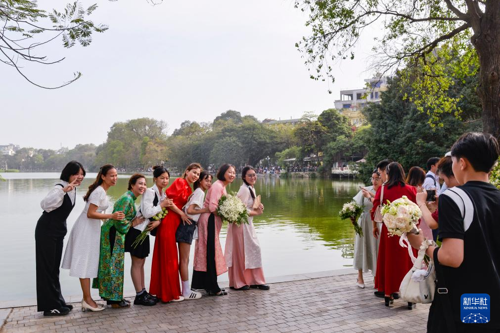 4月13日,在越南首都河内,人们游览还剑湖时拍照。