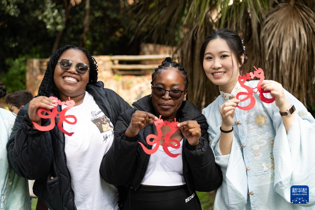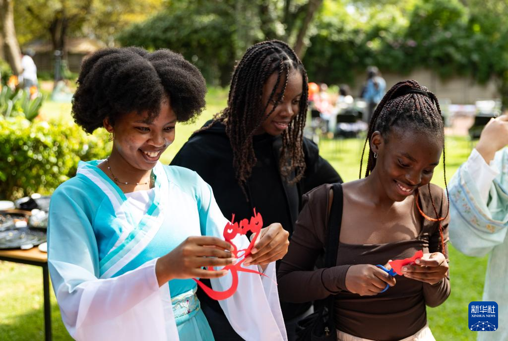 4月17日,在南非约翰内斯堡,学生与孔子学院志愿者在“国际中文日”活动上展示剪纸。