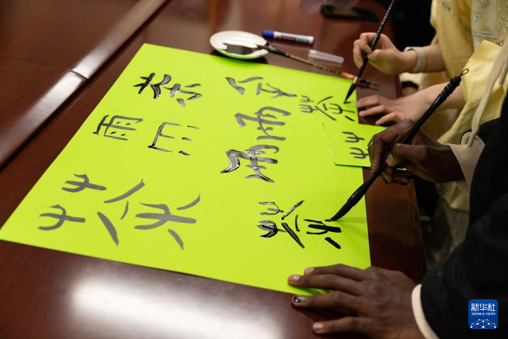 4月17日,在南非约翰内斯堡,学生在“国际中文日”活动上写毛笔字。