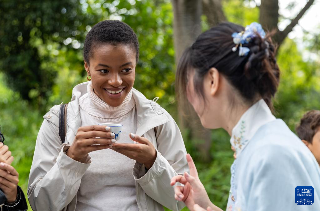 4月17日,在南非约翰内斯堡,学生在“国际中文日”活动上品尝中国茶。