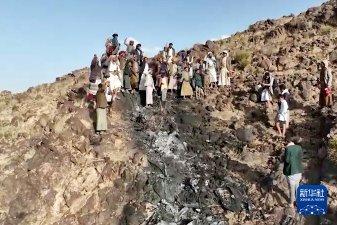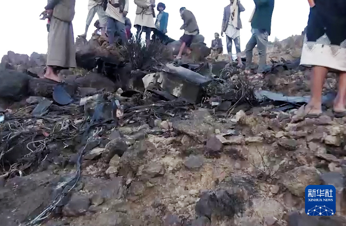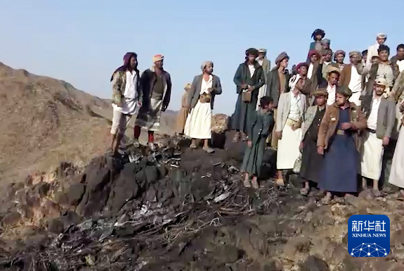 这张胡塞武装媒体中心提供的视频截图显示,4月19日,在也门萨那省,人们聚集在被击落的美军MQ-9无人机残骸附近。新华社发