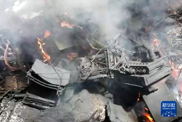 这张胡塞武装媒体中心提供的视频截图显示,4月19日,在也门萨那省,被击落的美军MQ-9无人机残骸正在燃烧。新华社发