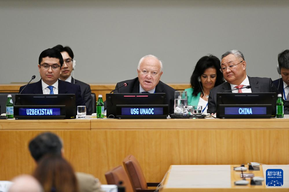 6月9日,在位于纽约的联合国总部,联合国副秘书长、联合国文明联盟高级代表莫拉蒂诺斯(前中)在“庆祝文明对话国际日”主题对话会上致辞。新华社记者 李睿 摄