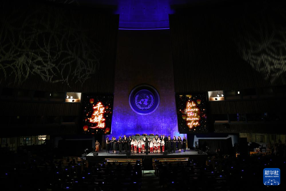 6月9日,在位于纽约的联合国总部,演员在“跨越山海的文明对话”专场文艺演出上表演合唱。新华社记者 李睿 摄