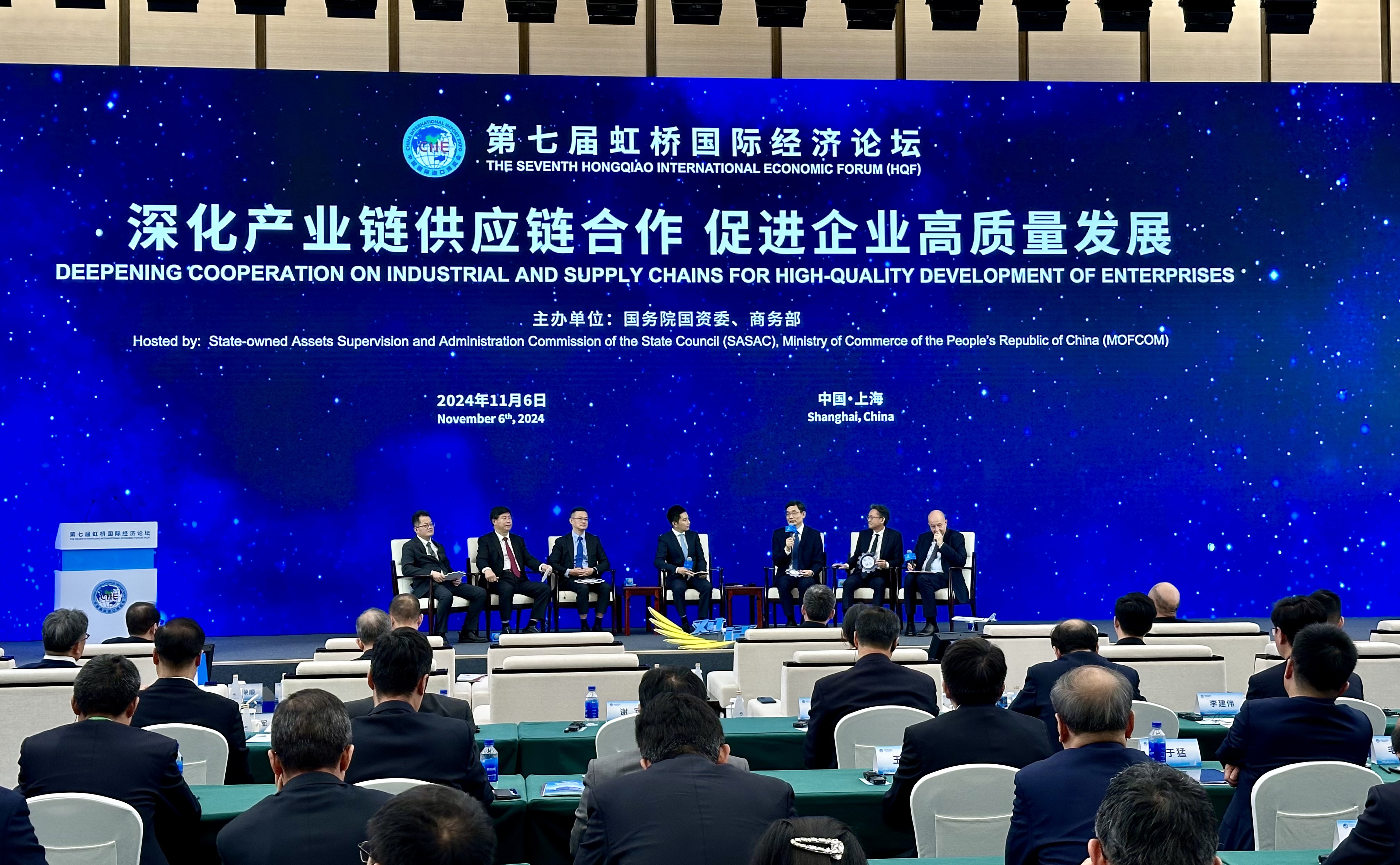各位来宾、女士们、先生们、朋友们:欢迎大家来到由中国国务院国资委和商务部共同举办的第七届虹桥国际经济论坛“深化产业链供应链合作 促进企业高质量发展”分论坛,为推动产业链供应链国际合作贡献智慧、凝聚共识。首先,我很荣幸地向大家介绍出席论坛的主要嘉宾,他们是:中国国务院国资委副主任、中央企业交易团团长苟坪先生,中国商务部部长助理唐文弘先生,中国科学院院士刘忠范先生,联合国贸易和发展会议宏观经济与发展政策司司长内斯维塔伊洛娃女士,以及来自中外政商学界的代表。让我们以热烈的掌声对他们的到来表示欢迎。今天的论坛分为嘉宾致辞、互动交流两个环节。下面进入第一个环节。首先有请中国国务院国资委副主任、中央企业交易团团长苟坪先生致辞。大家欢迎![ 2024-11-06 09:42 ]