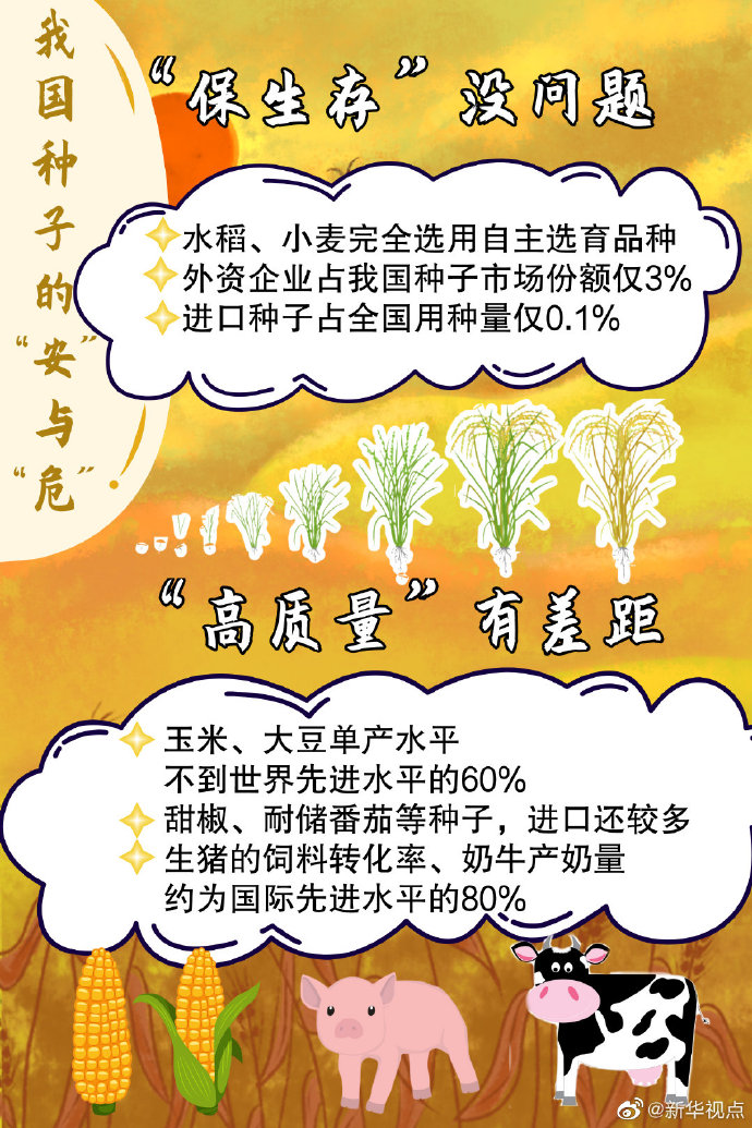 ——种源“卡脖子”。虽然在我国主要农作物中大部分种子为“自产”,但玉米、马铃薯等种子部分依赖进口。高端品种的蔬菜种子以进口为主。品种同质化现象严重,种业自主创新能力不足。