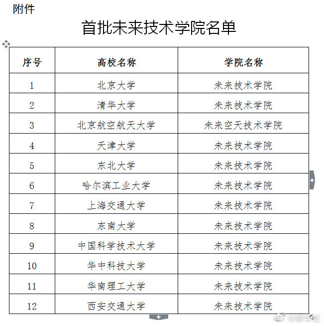 记者26日从教育部官网获悉,教育部办公厅日前下发通知,公布首批未来技术学院名单。包括北京大学、清华大学、北京航空航天大学等12所学校。按照通知,首批学院建设高校要瞄准未来10—15年的前沿性、革命性、颠覆性技术,着力培养具有前瞻性、能够引领未来发展的技术创新领军人才。(记者王鹏)