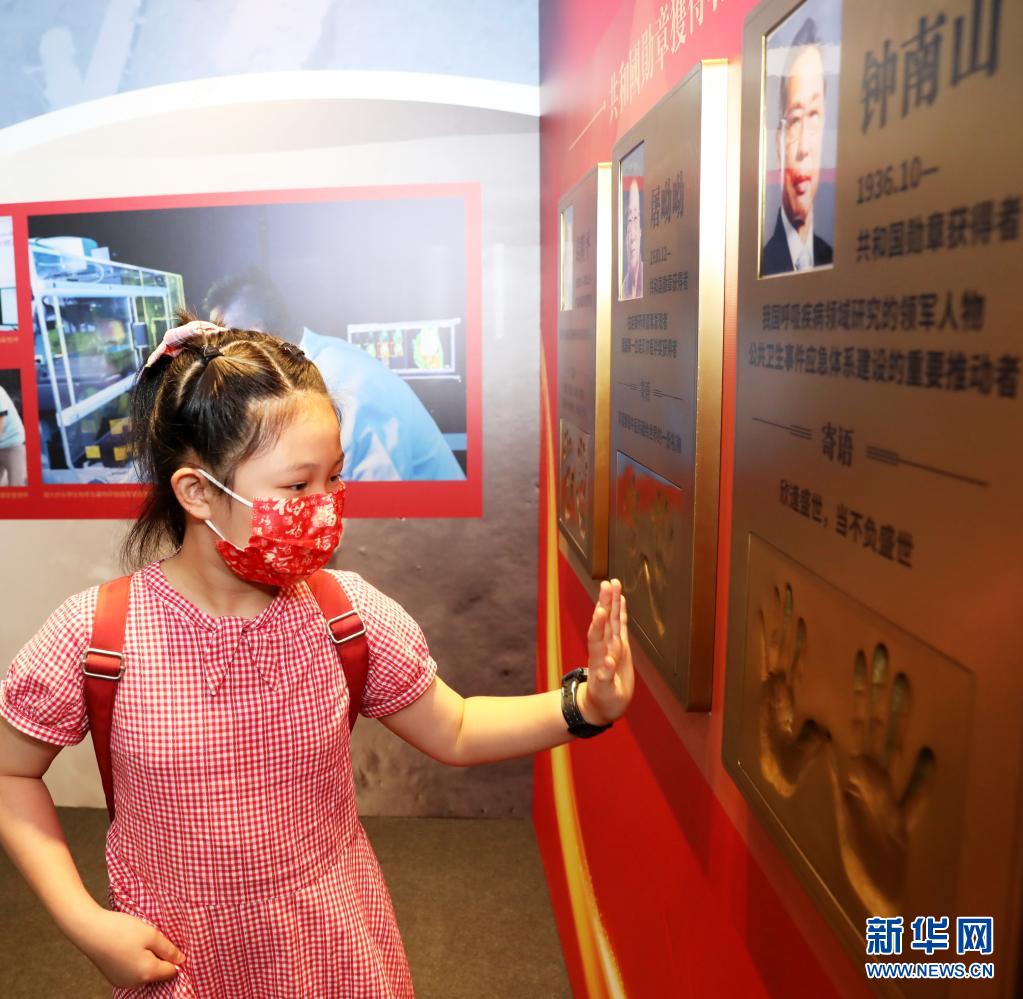 7月2日,一名女孩在“共和国勋章获得者手模”的展板前参观。新华社记者 吴晓初 摄
