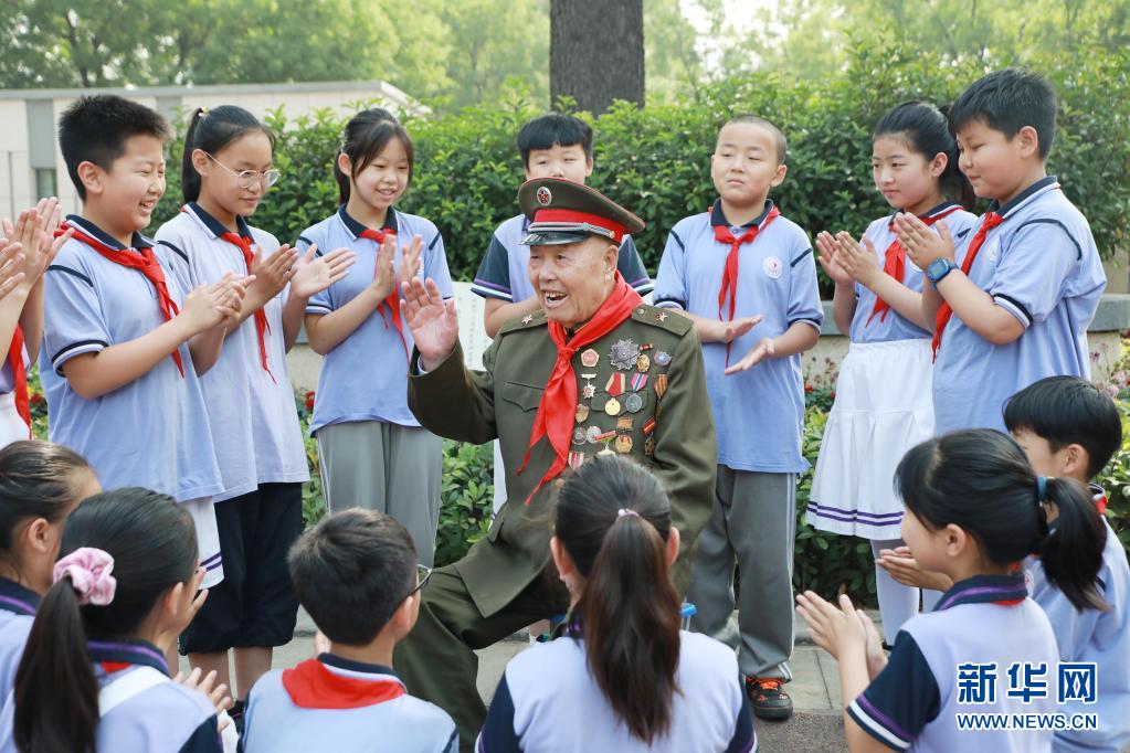 王占山(中)给河南省安阳市三官庙小学的少先队员们讲战斗故事(6月11日摄)。新华社发(戴丹华 摄)