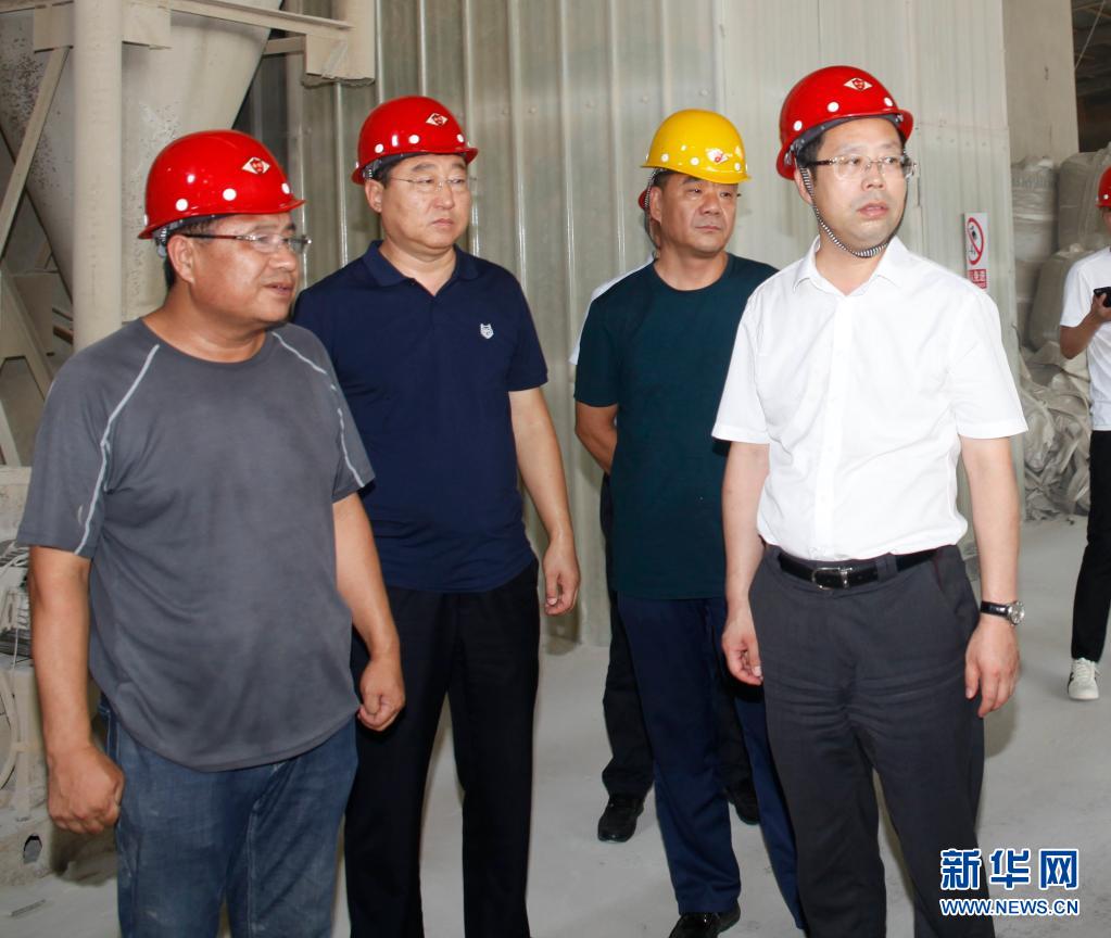 2018年8月4日,时任海城市委书记闻然(右一)在调研菱镁产业发展情况。新华社发