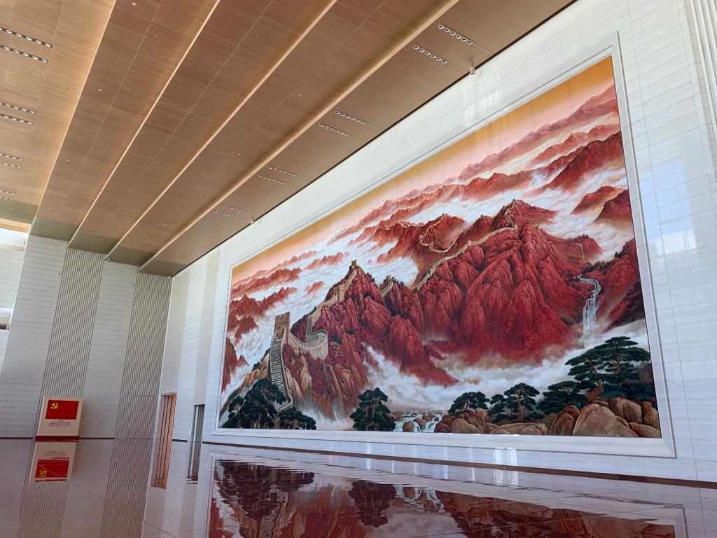 这幅漆画长40米、高15米,由100块漆板拼接而成,作者是清华大学美术学院教授程向军。在中国共产党成立100周年纪念币、《中国共产党成立100周年》纪念封上都有《长城颂》的身影。
