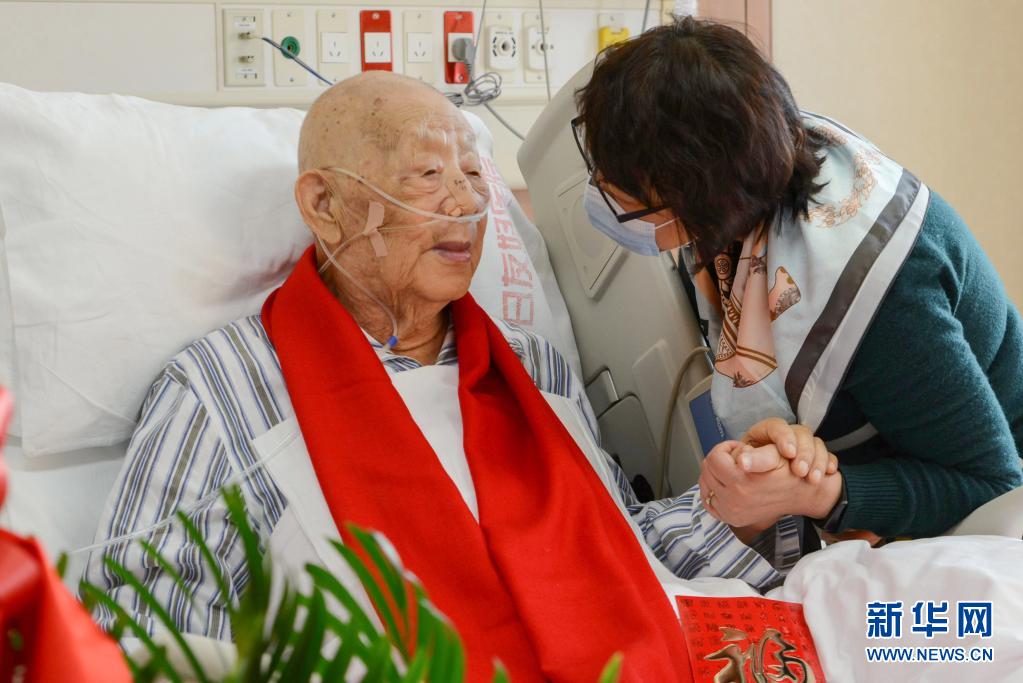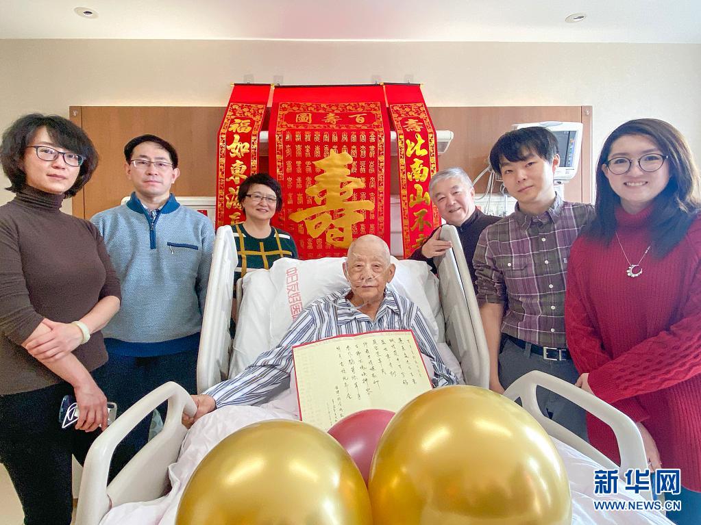 2021年2月12日,辛育龄在北京中日友好医院庆祝百岁生日,与家人合影。新华社发(蔡莹莹 摄)