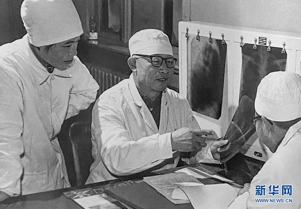 1980年1月16日,辛育龄(中)在内蒙古结核病院与胸外科医师讨论病例(翻拍照片)。新华社记者 张玉薇 摄