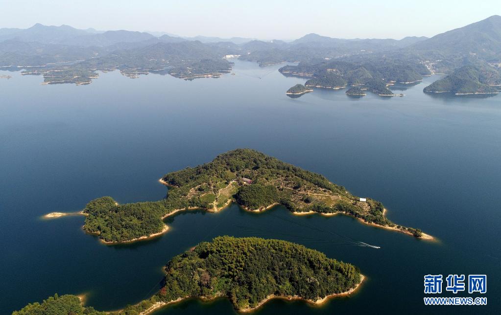 一艘快艇行驶在位于安徽省六安市金寨县的响洪甸水库内。响洪甸水库是新中国成立后治理淮河水患的一座大型水库(2017年9月17日摄)。新华社记者 陶明 摄