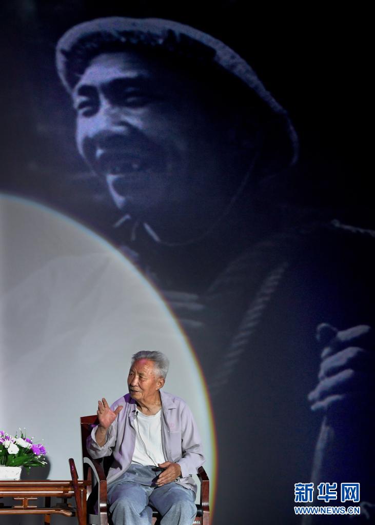 任羊成在红旗渠干部学院向学员们讲述当年修渠的情景,背后的大屏幕展示着他当年在施工现场的照片(2019年7月3日摄)。新华社记者 李安 摄