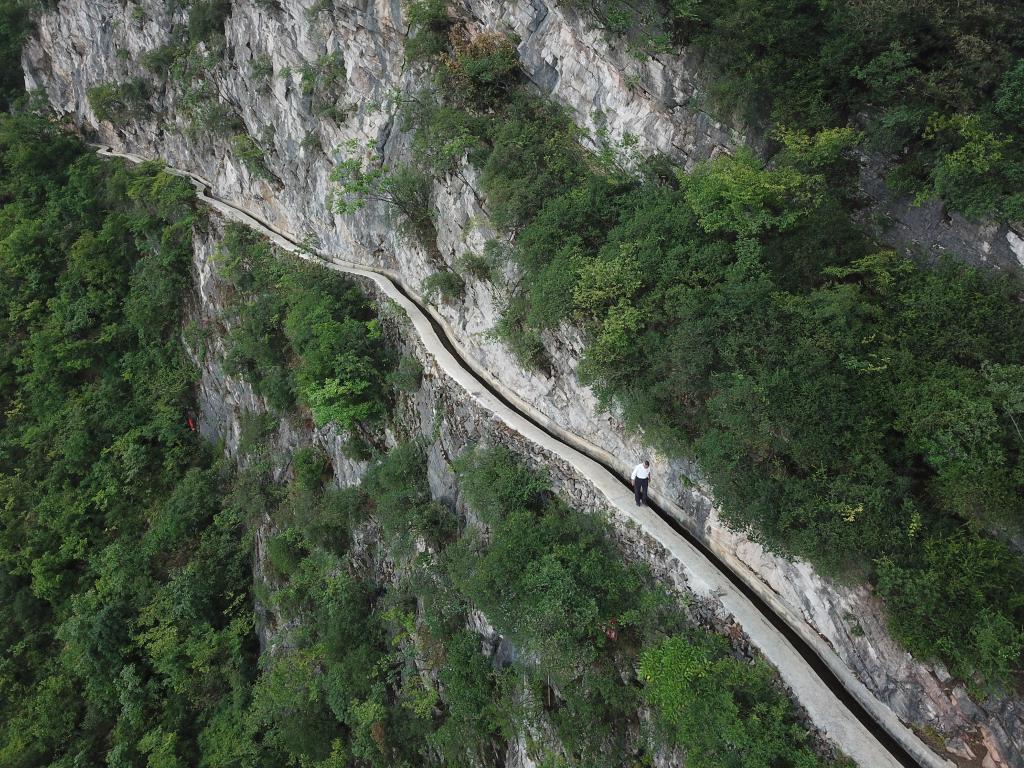 黄大发沿着修建在绝壁上的“大发渠”巡查(2018年8月11日无人机拍摄)。新华社记者刘续摄