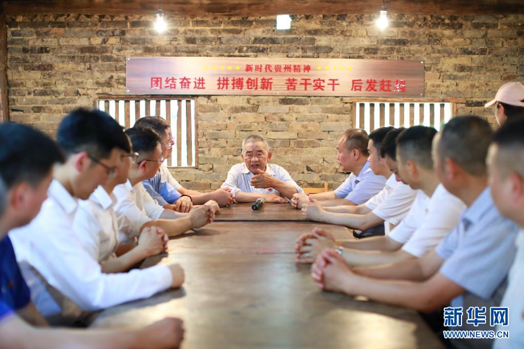 黄大发为前来参加党建活动的人们讲述修渠故事(6月16日摄)。新华社记者 刘续 摄